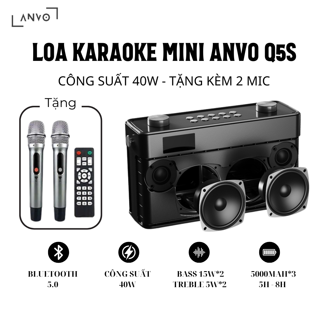 Loa Karaoke Mini ANVO Q5S công suất 40w - kèm 2 micro, chính hãng, bảo hành 12 tháng