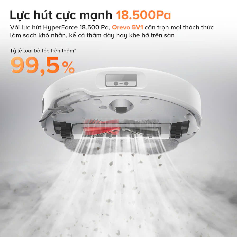 Với lực hút HyperForce lên đến 18.500 Pa, Roborock Q Revo Edge 5V1 dễ dàng đánh bay bụi bẩn, lông thú cưng và các hạt nhỏ trên thảm, sàn gỗ hay gạch men. Kết hợp cùng chổi chính DuoDivide, robot đảm bảo không bỏ sót bất kỳ vết bẩn nào, mang lại không gian sống tinh tươm và sạch sẽ chỉ trong một lần vận hành.